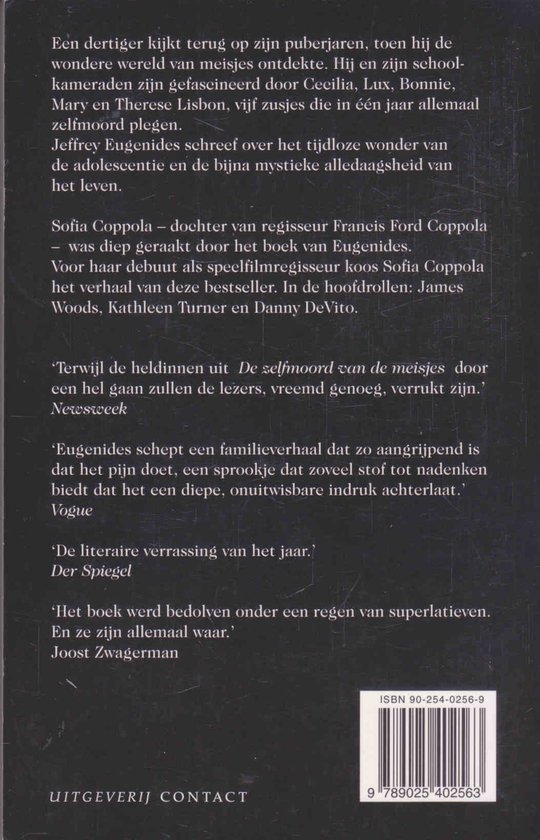 Titel: De zelfmoord van de meisjes. Uitgeverij: Contact. Jaartal: 1993. Bladzijden: 204. Vertaler: Mieke Lindenburg. Genre: psychologisch verhaal. Leeftijd: 18+ (roman) later uitgegeven door uitgeverij Prometheus. dit boek is in 1999 door Sofia Coppola verfilmd als 'The virgin suicides'.