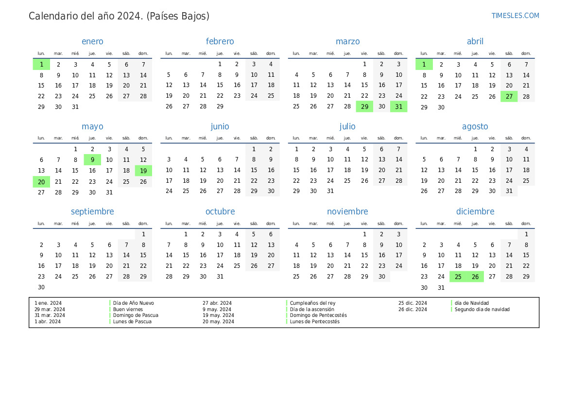 Los días festivos nacionales en los Países Bajos en 2024 son Año Nuevo (1 de Enero), Pascua (31 de Marzo), Pascua (1 de Abril), Koningsdag (27 de Abril), Jueves de Ascensión (9 de Mayo), Pentecostés (19 de Mayo), Tweede Pinksterdag (20 de Mayo), Navidad (25 de Diciembre) y Tweede Kerstdag (26 de Diciembre).