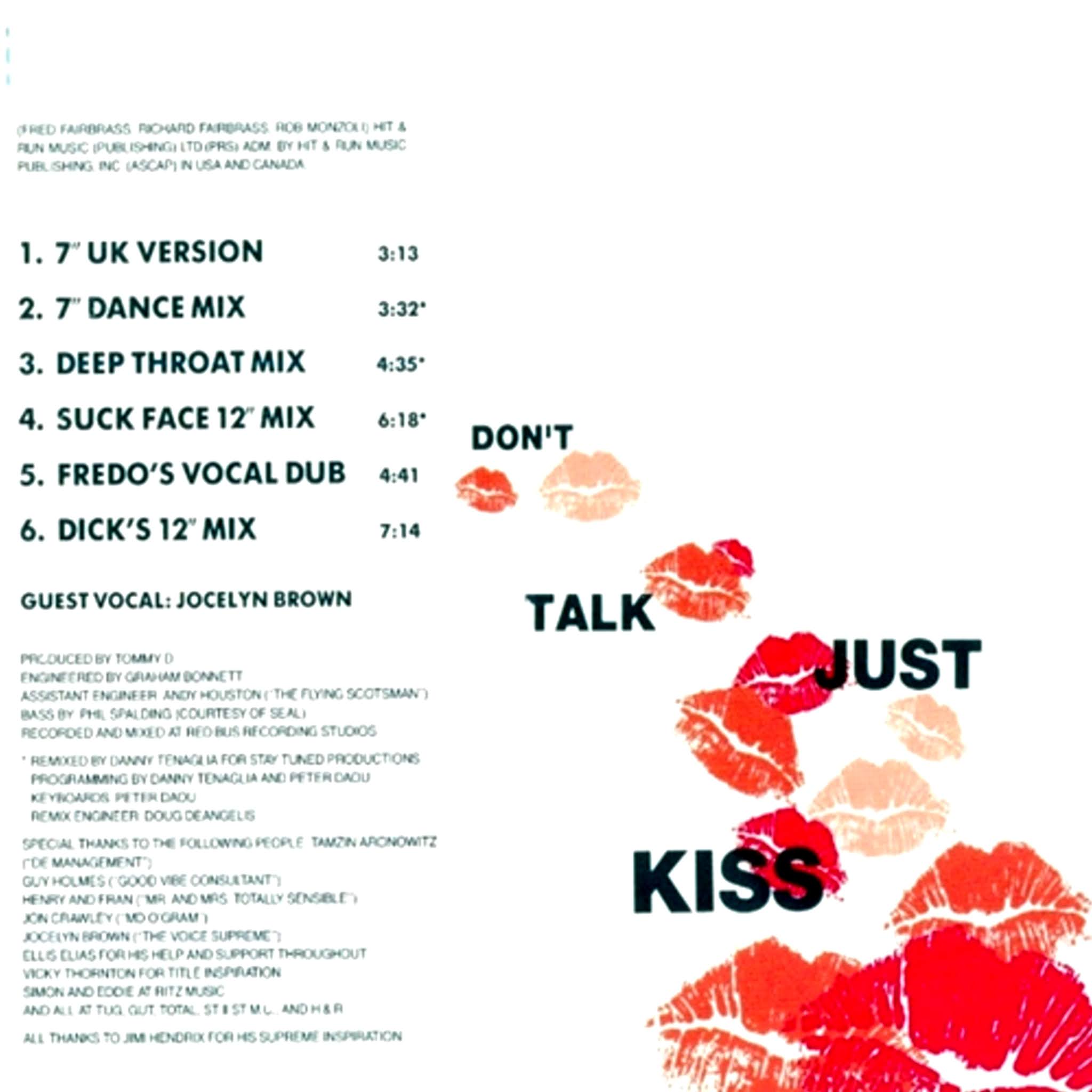 Music video. "Don't Talk Just Kiss" on YouTube. " Don't Talk Just Kiss " is a song by English pop trio Right Said Fred, released in November 1991 by Tug Records as the second single from their debut album, Up (1992). The song was written by Richard Fairbrass, Fred Fairbrass and Rob Manzoli, and produced by Tommy D.
