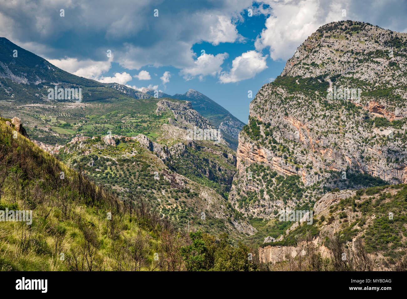 Gole del Raganello (Raganello Canyon), town of Civita on left, Pollino Massif in distance