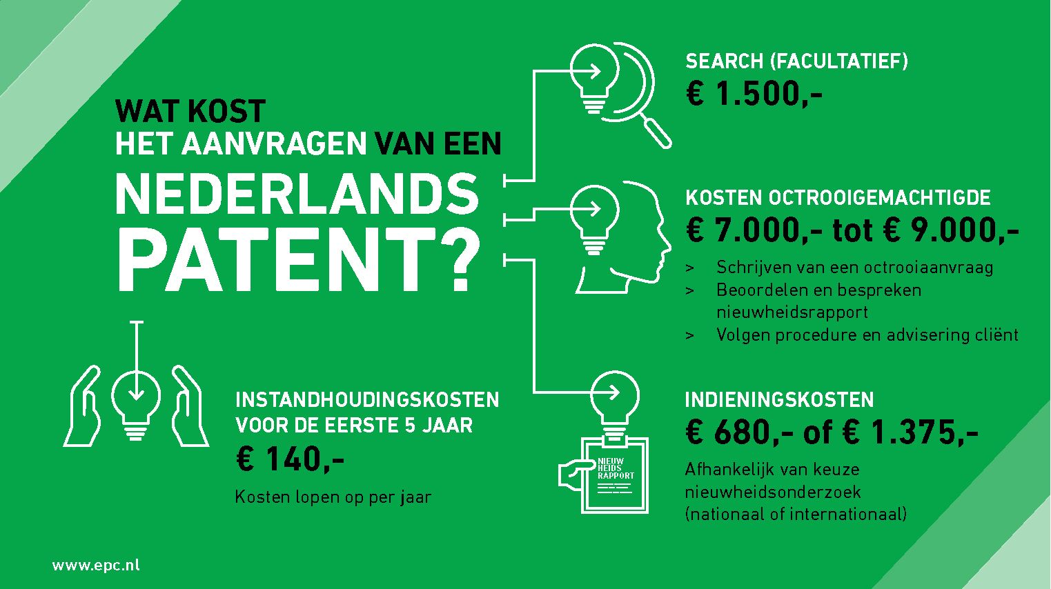 Deze taksen lopen per jaar op. Voor een Europees patent liggen de kosten hoger. Tussen €13.000 en €16.000 voor een patentaanvraag in één land. Ook hier gelden nog jaarlijkse instandhoudingstaksen. WAT KOST EEN NEDERLANDS OCTROOI. De kosten voor het aanvragen van een Nederlands patent is opgebouwd uit de volgende onderdelen: